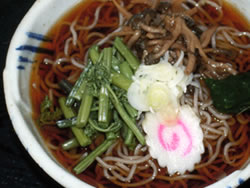 左から、とろろ、煮しめじ、おしんこ、みそおでん、ご飯、おそばです。